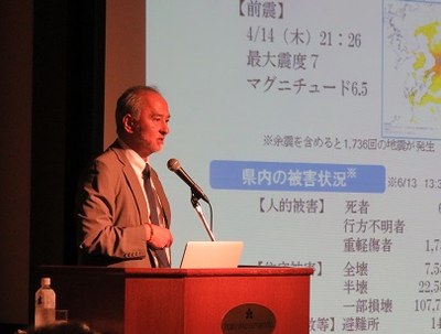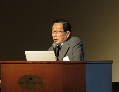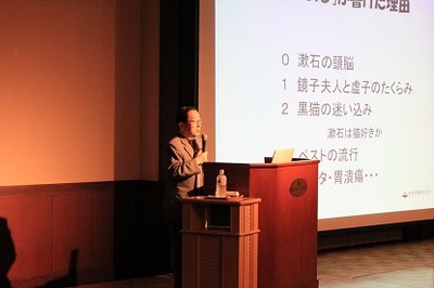 引き続き行われた講演会では、原田学長から『平成28年(2016年)熊本地震 熊本大学の震災復興』と題した基調講演が、小野友道氏(熊本大学名誉教授、熊本機能病院顧問、昭和41年医学部卒)から『漱石来熊120年ー「医者の目で『吾輩は猫である』を読んでみる」』と題した特別講演が行われました。