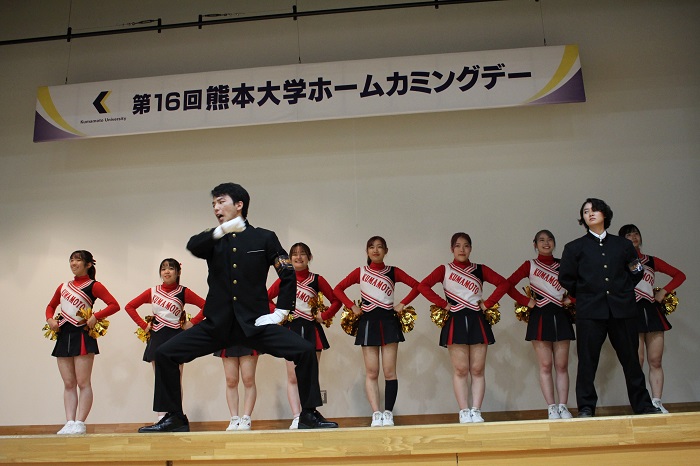 ? 引き続き行われた交流会は、村田 熊本大学同窓会連合会会長の挨拶の後、原 熊本大学関西連合同窓会会長の乾杯の発声で、4年ぶりに飲食を伴って実施されました。交流会の中盤には、熊本大学フィルハーモニーオーケストラによる木管楽器による演奏が披露され、終盤には、恒例となっている応援団のリーダー部とチアリーディング部による演舞が披露され、最後に旧制第五高等学校寮歌「武夫原頭に草萌えて」では参加者も一緒になり大合唱となりました。