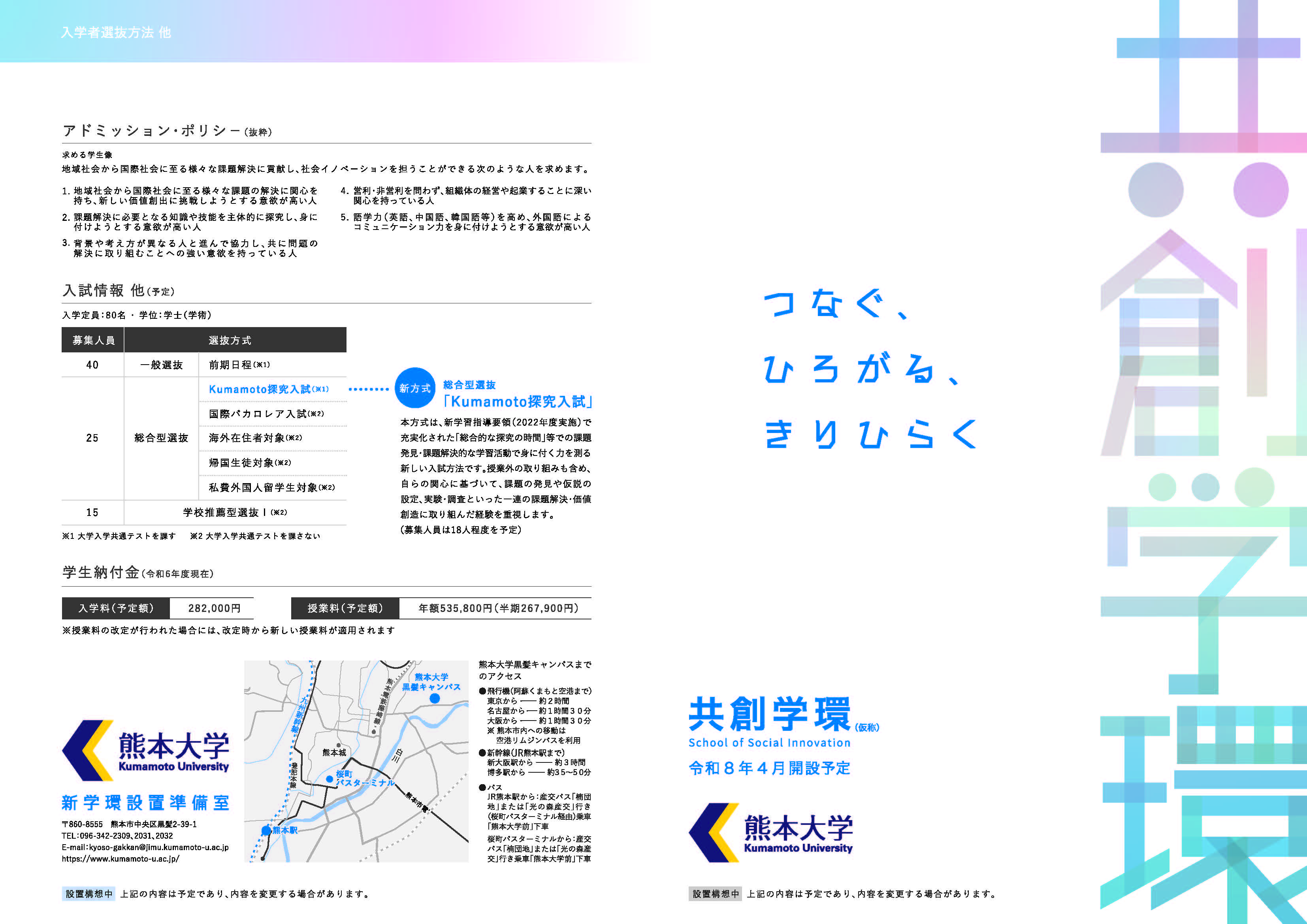 令和6年7月30日、熊本大学は、学生が所属する新しい学部組織(学士課程)として、地球規模の視野と地域の視点で考え行動し、共生共創する地域をデザインできる課題解決発見?設定?解決型人材並びに社会イノベーションを創出する人材を育成する学部等連係課程「共創学環(仮称)」を、令和8年度に設置する構想を発表しました。