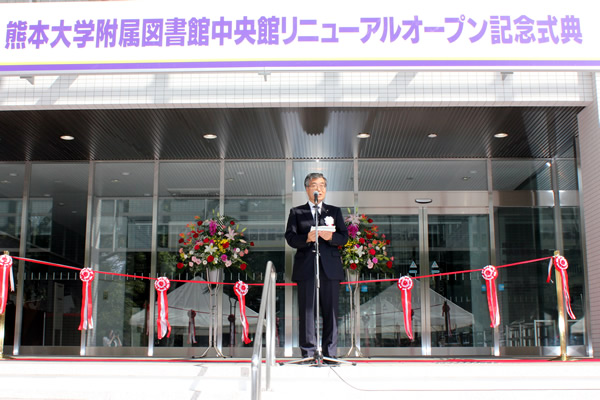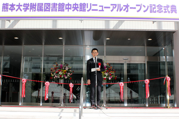 熊本大学は、平成25年10月1日に学内外関係者約70名の出席のもと附属図書館中央館リニューアルオープン記念式典を挙行しました。式典では、谷口功学長の式辞に続き、長澤公洋文部科学省研究振興局参事官(情報担当)付学術基盤整備室長から祝辞がありました。