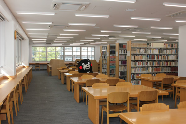 続いて、図書館職員から利用者代表への記念品贈呈、利用者代表から大学関係者への花束贈呈、関係者によるテープカットが行われ、記念品贈呈からは、熊本県民を代表してくまモンも駆けつけ、みごとな(?)パフォーマンスを披露しました。