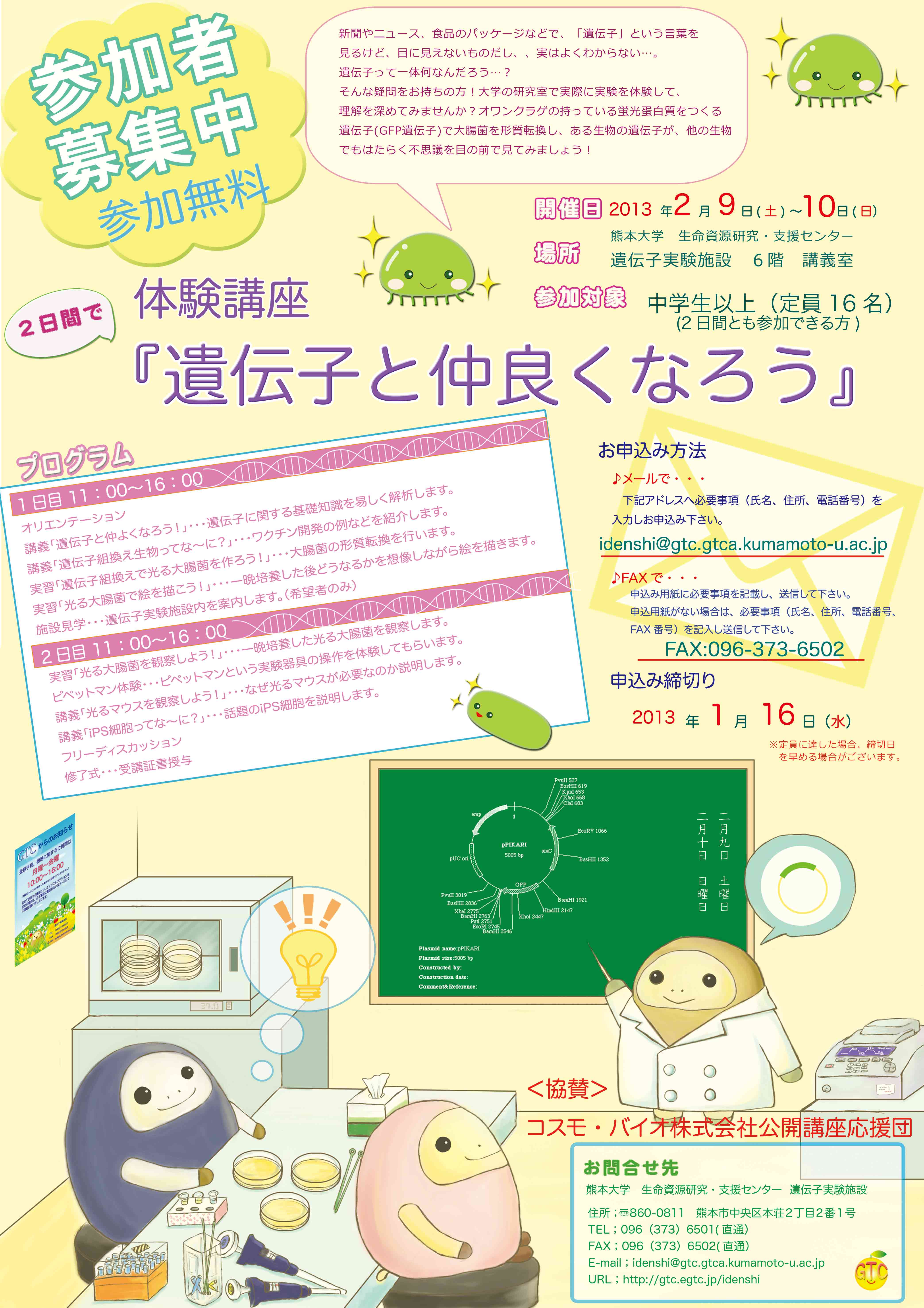 今年度も体験講座「遺伝子と仲良くなろう」を開催します。