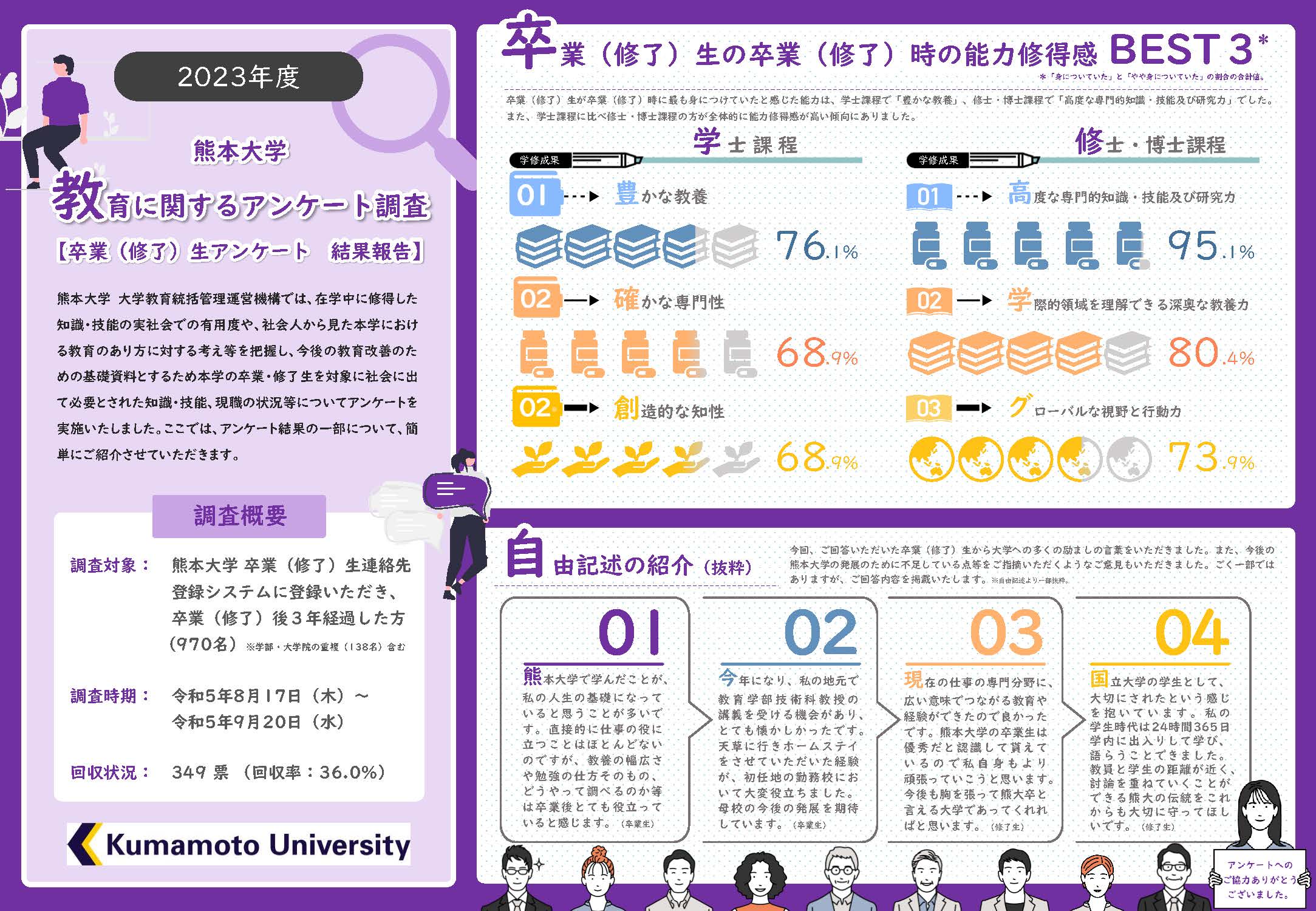 熊本大学では、卒業?修了から3年以上経過した方を対象として、社会人から見た本学教育のあり方等を調査する「卒業?修了生アンケート」を毎年度実施しています。令和7年8月7日~9月26日において実施した「令和7年度熊本大学卒業?修了生アンケート」は終了いたしました。ご協力をいただいた皆様へ心より感謝申し上げます。今回のアンケート結果をとりまとめ、大学教育のカリキュラム改善の貴重な資料として活用し、これらの調査を継続的に実施していくことで教育の質向上に役立てて参ります。