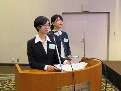 当日は、放送部の橋口弥生氏(放送部部長、法学部2年)と犬塚千裕氏(放送部、文学部2年)の司会進行の下、総会が行われ、安田宏正会長(武夫原会理 事、昭和42年法文学部卒)、二塚信熊本大学同窓会連合会会長(熊杏会会長、昭和39年医学部卒)からの挨拶のほか、役員等紹介、平成25年度、26年度 の熊本大学卒業生表彰受賞者の紹介が行われました。