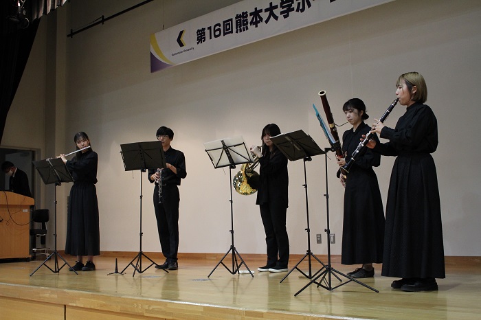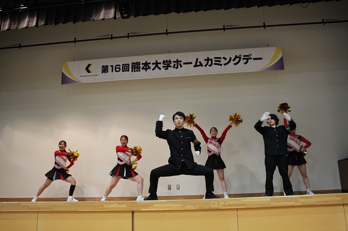 ? 引き続き行われた交流会は、村田 熊本大学同窓会連合会会長の挨拶の後、原 熊本大学関西連合同窓会会長の乾杯の発声で、4年ぶりに飲食を伴って実施されました。交流会の中盤には、熊本大学フィルハーモニーオーケストラによる木管楽器による演奏が披露され、終盤には、恒例となっている応援団のリーダー部とチアリーディング部による演舞が披露され、最後に旧制第五高等学校寮歌「武夫原頭に草萌えて」では参加者も一緒になり大合唱となりました。