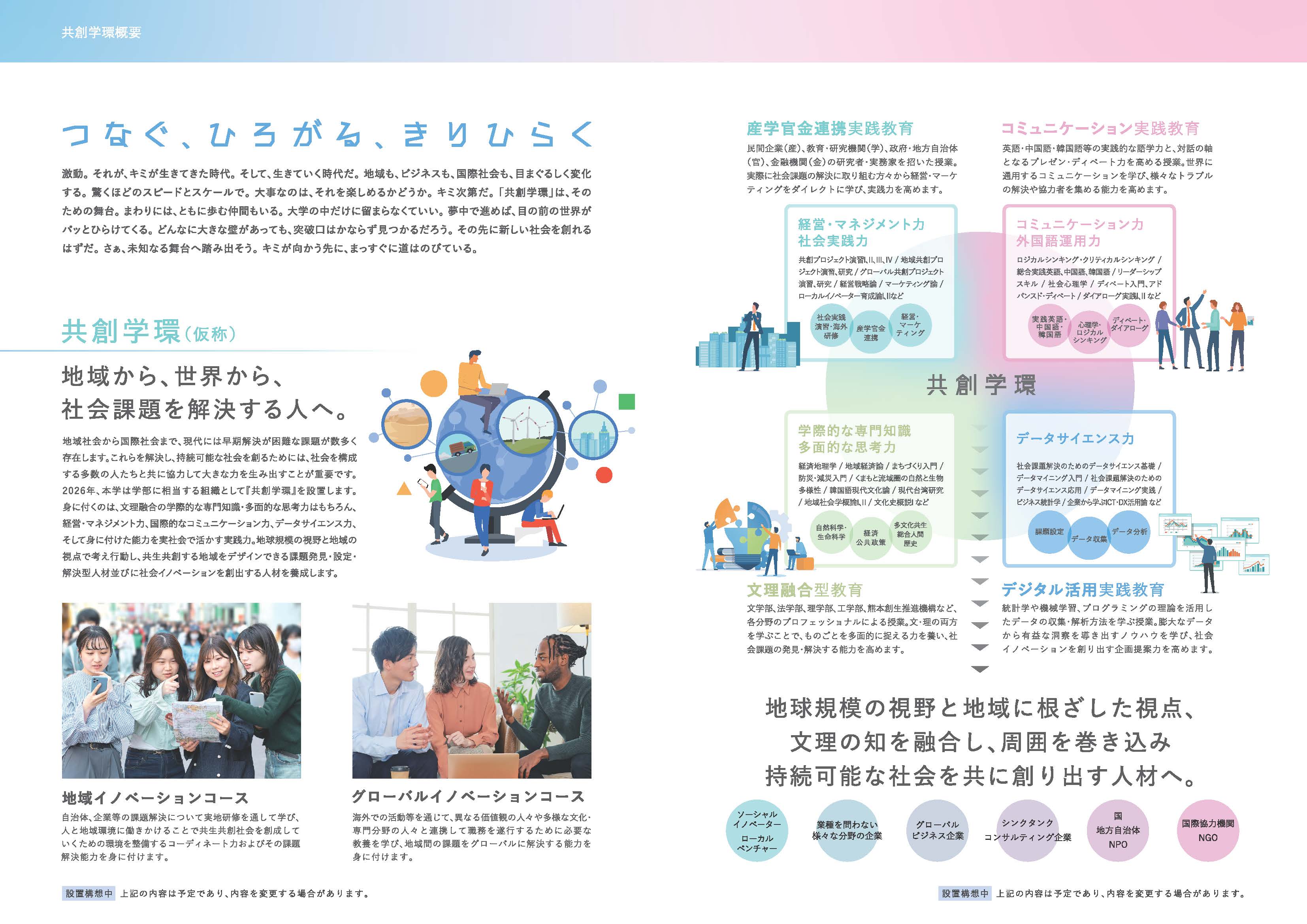 ※「共創学環(仮称)」設置構想については、今後、文部科学省 大学設置?学校法人審議会の審査を受ける予定です。構想は審査結果によって確定するものであり、変更の可能性があります。